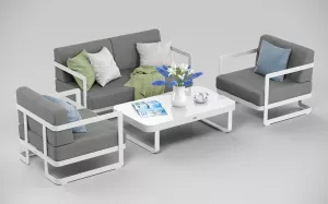 Материалы и цвета: каркас мебели выполнен из всесезонного алюминия с порошковым покрытием белого цвета, подушки спинок и сидений обшиты уличной тканью голубовато серого цвета (А13806) с водоотталкивающей пропиткой, толщина подушек 12 см, столешница кофейного столика глянцевая, изготовлена из закаленного стекла толщиной 5 мм с нанесением белого цвета с помощью шелкотрафаретной печати.
