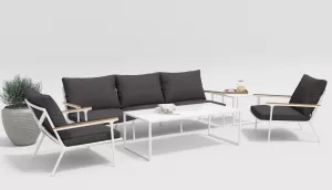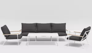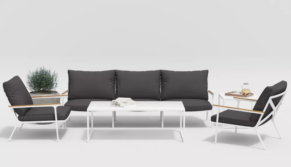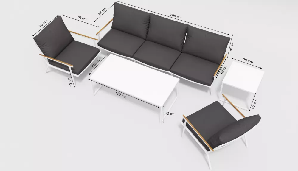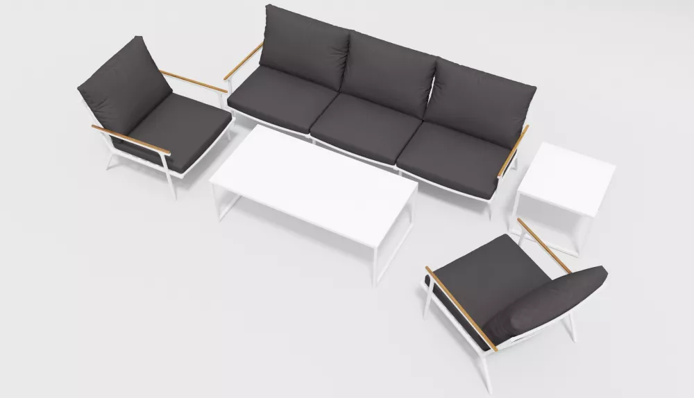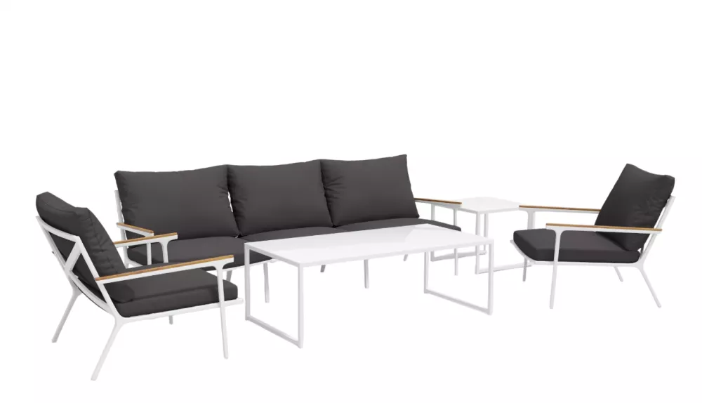 Материалы и цвета: каркас мебели выполнен из всесезонного алюминия с порошковым покрытием белого цвета, подлокотники кресел и дивана декорированы вставками из тика, подушки спинок и сидений обшиты уличной тканью темно-серого цвета (А13805) с водоотталкивающей пропиткой, толщина подушек сидений 10 см, столешница кофейного и журнального столиков глянцевая, изготовлена из закаленного стекла толщиной 5 мм с нанесением белого цвета с помощью шелкотрафаретной печати.