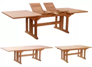 Раздвижной стол из тикового дерева с механизмом бабочки. Идеально подходит для большой компании из 12-14 человек. За счет ширины 120 см даже с торцов может комфортно разместиться по два человека. На нижней стороне имеются легко снимаемые металлические застежки, которые удерживают механизм двойного выдвижения на месте по всем направлениям.