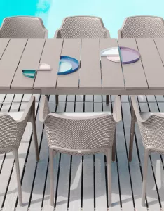 Современный дизайн и продуманный функционал станут прекрасным дополнением для патио. Изящные кресла Net подчеркнут индивидуальность пространства и помогут расставить правильные акценты. Выполненные из широких ламелей сиденье и спинка, подлокотники с плавными изгибами и оптимальная эргономика все это позволит наслаждаться отдыхом. Раздвижной стол с яркой индивидуальностью для большой компании со столешницей из полипропилена и ножками из окрашенного алюминия гармонично дополнит пространство обеденной зоны.