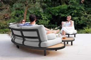 универсальный каркас, ткань подушек- серый олефин (водостойкая, устойчива к ультрафиолетовому излучению), чехлы черного цвета на все модули входят в комплект.