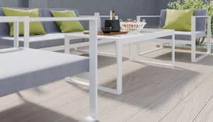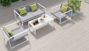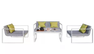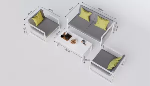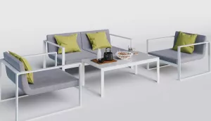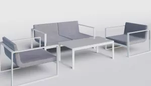 Материалы и цвета: каркас мебели выполнен из всесезонного алюминия с порошковым покрытием белого цвета, спинки и сидения обшиты уличной тканью голубовато серого цвета (А13806) с водоотталкивающей пропиткой, столешница кофейного столика глянцевая, изготовлена из закаленного стекла толщиной 5 мм с нанесением белого цвета с помощью шелкотрафаретной печати.