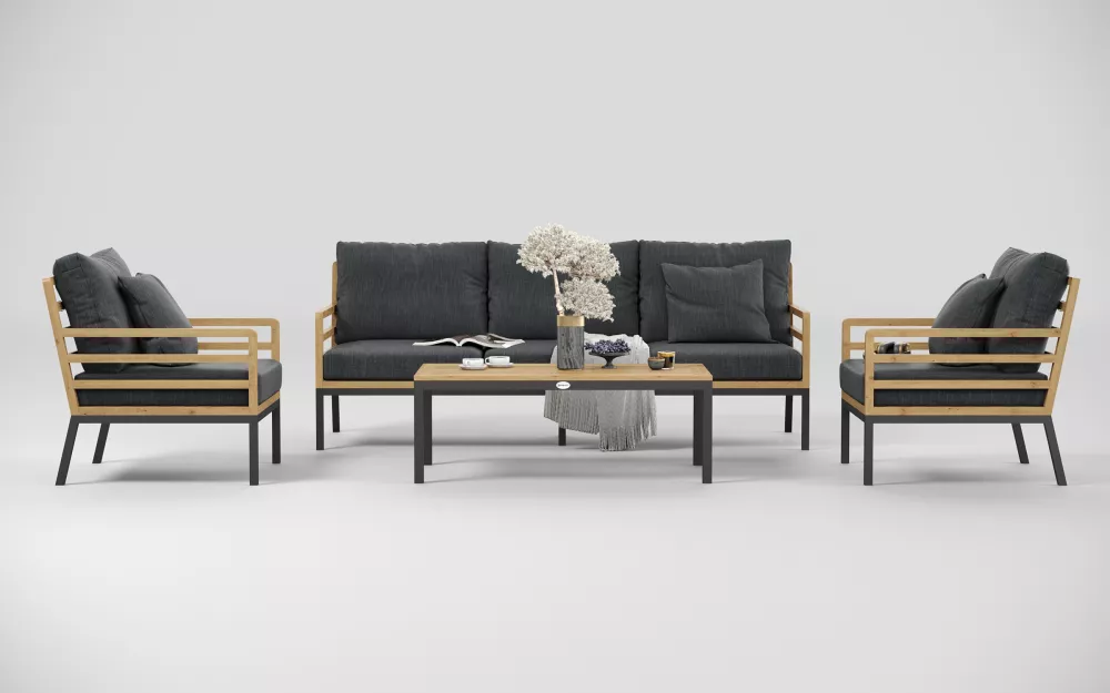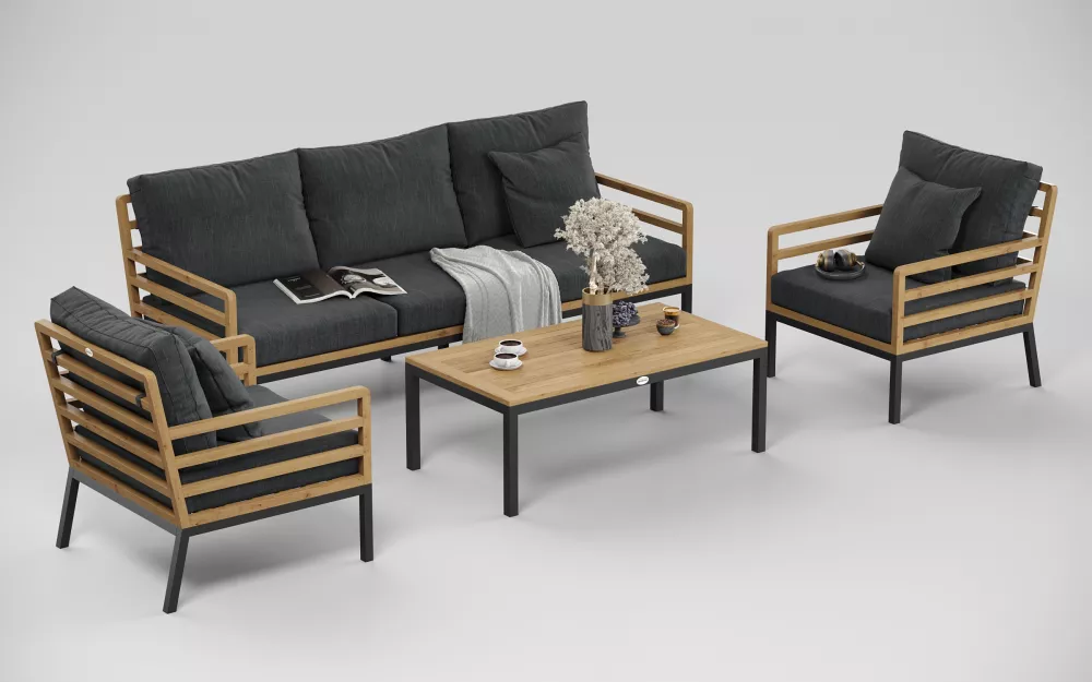 Материалы и цвета: каркас дивана и кресел изготовлен из тика, подножье выполнено из всесезонного, долговечного алюминия с порошковым покрытием темно - серого цвета (карбон), подушки спинки и сидений обшиты премиальная уличной тканью темно - серого цвета. Ткань устойчива к ультрафиолетовому излучению, водостойкая. Толщина подушек 12 см. Чехлы съемные. Каркас кофейного столика изготовлен из алюминия, столешница из тиковых планок