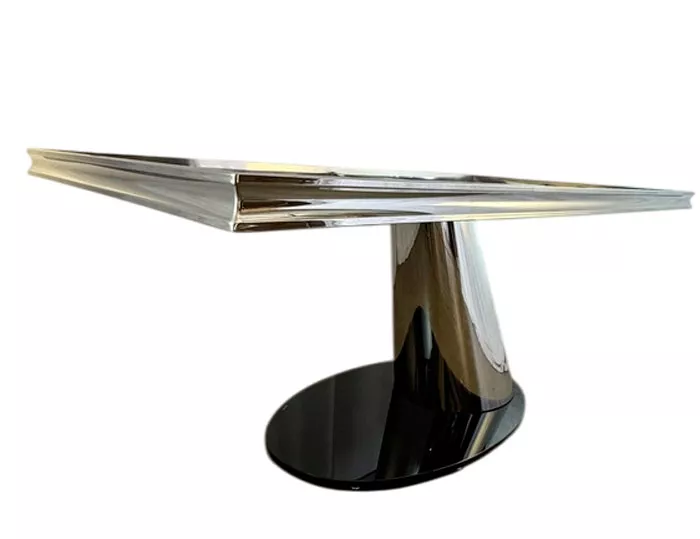 Подстолье из полированной нержавеющей (зеркальное) стали. В основании закаленное стекло толщиной 15 мм. Рама под столешницу размером 176х86 см