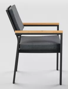 Особенности: каркас мебели выполнен из всесезонного алюминия с порошковым покрытием темно - серого цвета (карбон), подлокотники стульев декорированы вставками из тика, подушки сидений и спинки обшиты уличной тканью (олефин) темно - серого цвета, толщина подушек 5 см, чехол съемный на "молнии", столешница обеденного стола изготовлена из тиковых планок