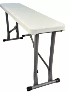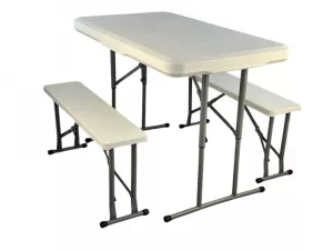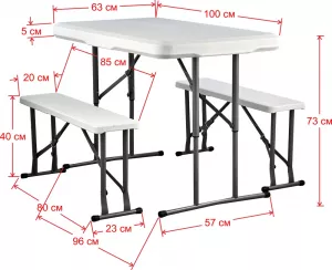 Складной набор для пикника: стол и две лавочки. Все складывается в один стол. Цвет: белый (гранит). Толщина столешницы 3.5 см. Размер в сложенном состоянии 64х107х9 см. Труба d25х0.8 мм. Характеристики