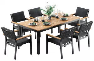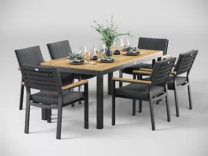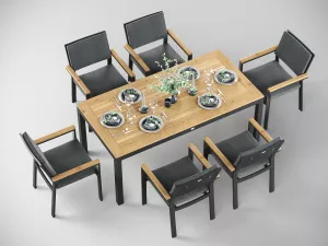 Особенности: каркас мебели выполнен из всесезонного алюминия с порошковым покрытием темно - серого цвета (карбон), подлокотники стульев декорированы вставками из тика, подушки сидений и спинки обшиты премиальной уличной тканью темно - серого цвета, толщина подушек 5 см, чехол съемный на "молнии", столешница обеденного стола изготовлена из тиковых планок