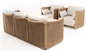 Плетеная мебель дополнена удобными подушками в бежевых чехлах. При их изготовлении используют полиэстер, плотность 300гр/м2. Он обрабатывается влагоотталкивающей пропиткой для повышения защитных свойств материала.