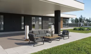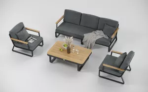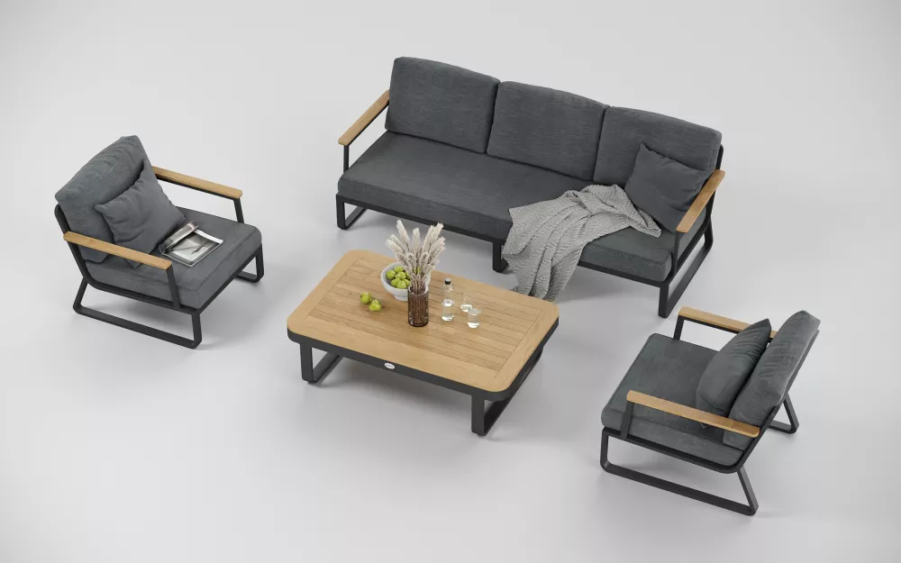 Материалы и цвета: каркас мебели выполнен из всесезонного, долговечного алюминия с порошковым покрытием темно - серого цвета (карбон), подлокотники дивана и кресел изготовлены из благородного тика, подушки спинок и сидений обшиты премиальной уличной тканью темно - серого цвета. Ткань устойчива к ультрафиолетовому излучению, водостойкая. Толщина подушек 12 см. Чехлы съемные. Столешница кофейного столика изготовлена из тиковых планок.
