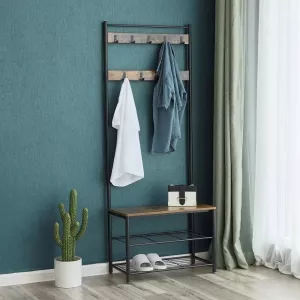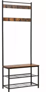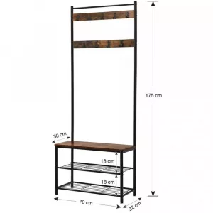 Металлические трубы с матовой поверхностью и ДСП класса Е1 в винтажном стиле делают скамейку для обуви прочной и устойчивой; деревянная полка выдерживает нагрузку до 80 кг.