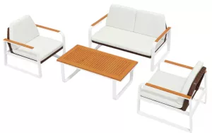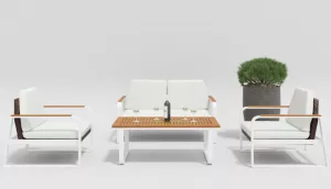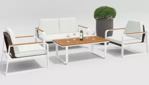 Материалы и цвета: каркас мебели выполнен из всесезонного алюминия с порошковым покрытием белого цвета, основа для сидений сделана из искусственного ротанга темно-коричневого цвета, подушки спинок и сидений обшиты уличной тканью белого цвета (А14814) с водоотталкивающей пропиткой, толщина подушек 6 см, столешница кофейного столика и подлокотники мебели изготовлены из тика.