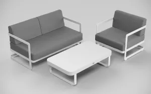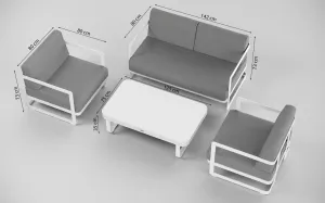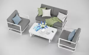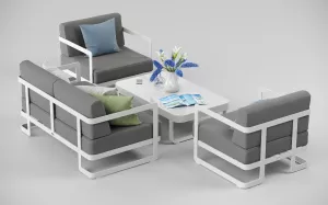 Материалы и цвета: каркас мебели выполнен из всесезонного алюминия с порошковым покрытием белого цвета, подушки спинок и сидений обшиты уличной тканью голубовато серого цвета (А13806) с водоотталкивающей пропиткой, толщина подушек 12 см, столешница кофейного столика глянцевая, изготовлена из закаленного стекла толщиной 5 мм с нанесением белого цвета с помощью шелкотрафаретной печати.