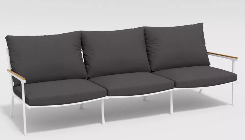 Материалы и цвета: каркас мебели выполнен из всесезонного алюминия с порошковым покрытием белого цвета, подлокотники кресел и дивана декорированы вставками из тика, подушки спинок и сидений обшиты уличной тканью темно-серого цвета (А13805) с водоотталкивающей пропиткой, толщина подушек сидений 10 см, столешница кофейного и журнального столиков глянцевая, изготовлена из закаленного стекла толщиной 5 мм с нанесением белого цвета с помощью шелкотрафаретной печати.