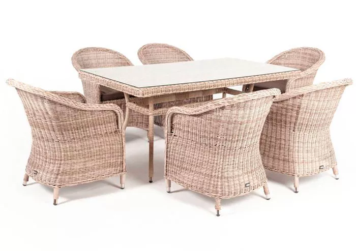 Премиальная обеденная группа для большой компании. В набор входит большой прямоугольный стол, размером - 1600Ч900Ч750 мм и 6 кресел, размер - 570Ч680Ч810 мм, в бежевом оттенке.