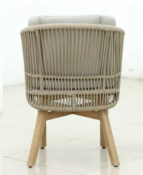 Обеденные кресла, вдохновленные побережьем, имеют прочный алюминиевый каркас, оплетенный роупом, очаровательные ножки из эвкалипта и мягкие, удобные подушки, предназначенные для круглогодичного отдыха на открытом воздухе и развлечений. Большой обеденный стол, рассчитанный на 6 персон, выполнен из эвкалипта, круглая столешница - из искусственного камня Travertine.
