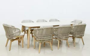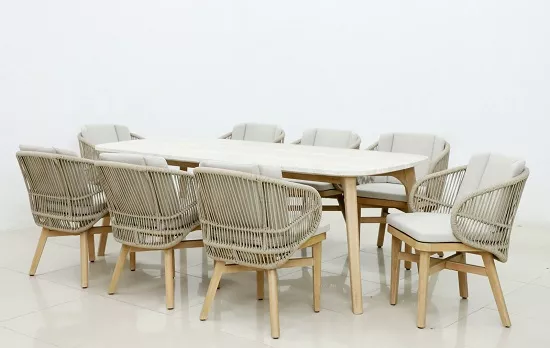 Этот ансамбль из эвкалипта с обеденным столом с оригинальной столешницей и шестью мягкими креслами с плетением из роупа, создан для незабываемых моментов на свежем воздухе.