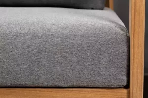 Эффектное сочетание натуральной фактуры массива тика и стильных светло-серых подушек.