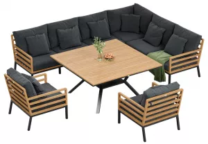 Материалы и цвета: каркас диванов изготовлен из тика, подножье выполнено из всесезонного, долговечного алюминия с порошковым покрытием темно - серого цвета (карбон), подушки спинки и сидений обшиты премиальной уличной тканью темно - серого цвета. Ткань устойчива к ультрафиолетовому излучению, водостойкая. Толщина подушек 12 см. Чехлы съемные. Каркас стола изготовлен из алюминия, столешница из тиковых планок