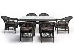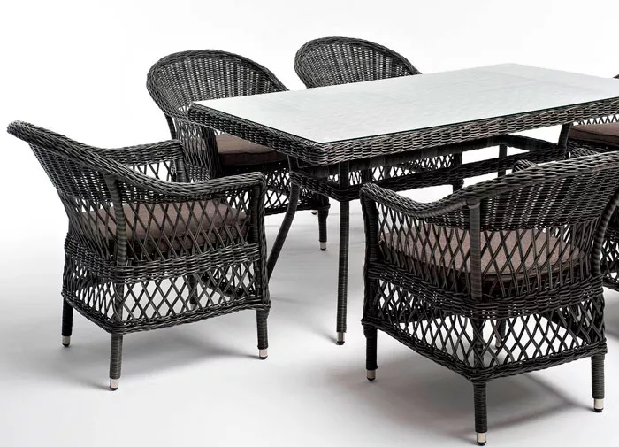 Комплект из искусственного ротанга обеденный относится к числу садовой мебели для обустройства открытых кафе, террас и веранд.