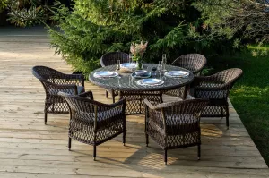 Искусственная плетеная мебель на 5 человек - круглый обеденный стол (1500Ч1500Ч750 мм) с ударопрочной стеклянной столешницей и 6 кресел коллекции (590Ч640Ч820 мм).