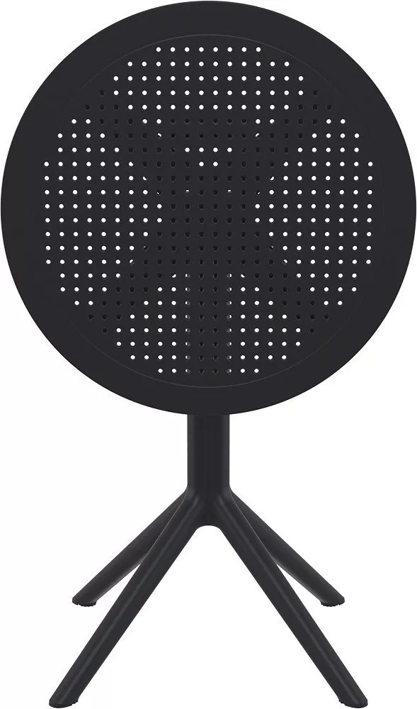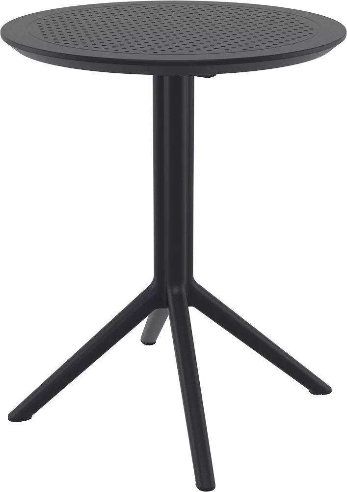Круглый складной пластиковый стол со столешницей из погодостойкого пластика и каркасом из металла.