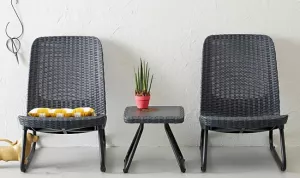 Компактный и стильный комплект отлично подходит на роль мебели для балкона, а так же для оформления зоны отдыха у бассейна. Металлические ножки обеспечивают устойчивость и амортизацию сидящего, маленький столик идеален для стаканов с коктейлем. Словом комплект мебели идеален для отдыха вдвоем