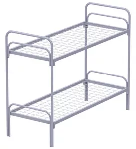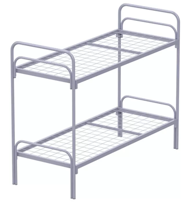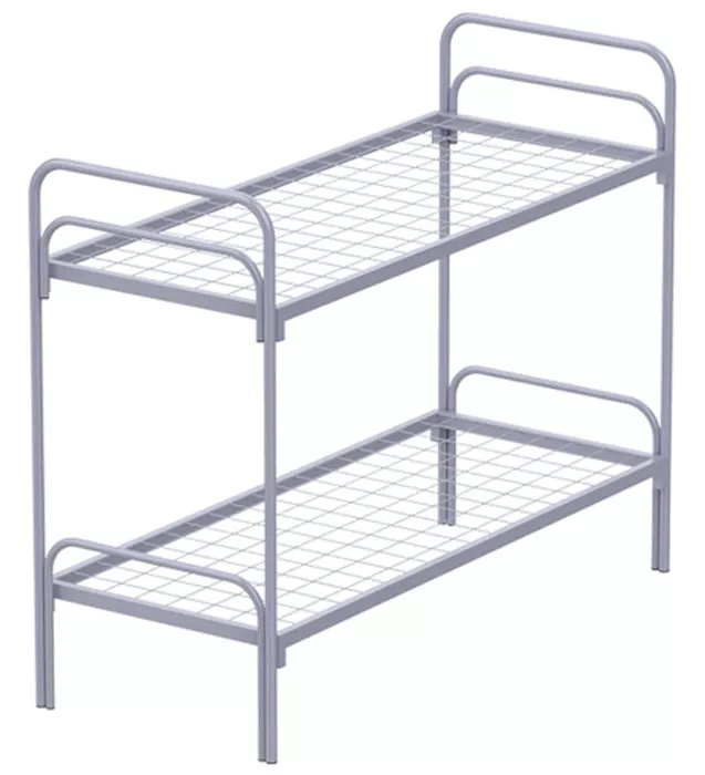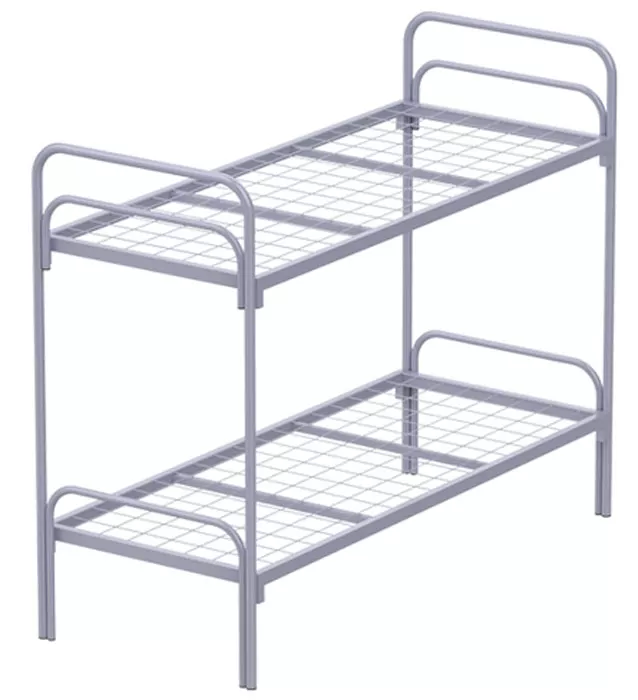 Двухъярусная металлическая кровать. Она часто используется в бытовках, хостелах, домах, общежитиях, гостиницах, спортивных залах и других местах, где нужно разместить несколько человек в одной комнате.