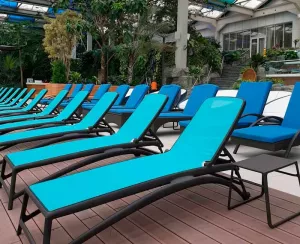Тканевое покрытие лежаков - инновационный материал для улицы - текстилен. Текстилен - прочный высокотехнологичный полиэстер, который отлично подходит для использования на открытом воздухе. Ткань не выгорает даже под прямыми солнечными лучами, она не повреждается от воздействия влаги и может эксплуатироваться при любых погодных условиях. Текстилен не вызывает аллергии, не гниет и имеет высокую прочность на разрыв. Лежаки с текстиленом - идеальный вариант для пляжа и бассейна.