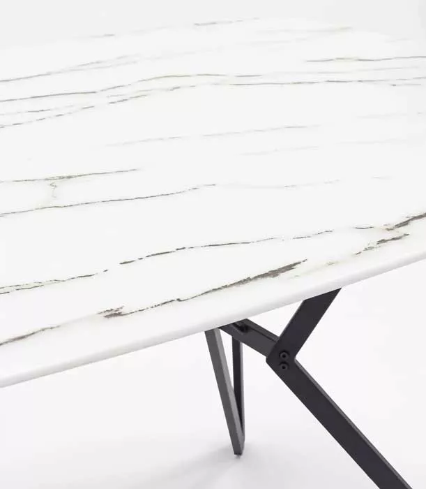 Белая столешница контрастирует с черным геометричным металлическим основанием. Ножки покрыты порошковой краской. В основании специальные подпятники. Они помогут избежать царапин и отрегулировать стол по высоте, если на полу имеются неровности.