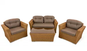 Футбольная тематика плетеной мебели премиум класса - это настоящий подарок для ярых поклонников футбола. Эта величественная и необыкновенная мебель из высококачественного искусственного ротанга несомненно привлечет внимание каждого человека своей неординарностью и уникальностью. Австрийские дизайнеры продумали в этом комплекте все до мелочей. Журнальный столик напоминает футбольное поле с воротами. Кресла и диван комплектуются зелеными подушками в цвет футбольного газона, а боковые подлокотники и спинка сидений напоминают классическую расцветку футбольного мяча. В совокупности это просто роскошный комплект, достойный настоящих чемпионов. Характеристики