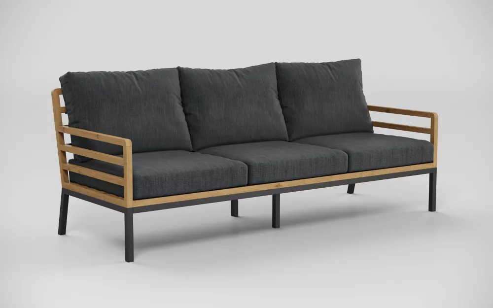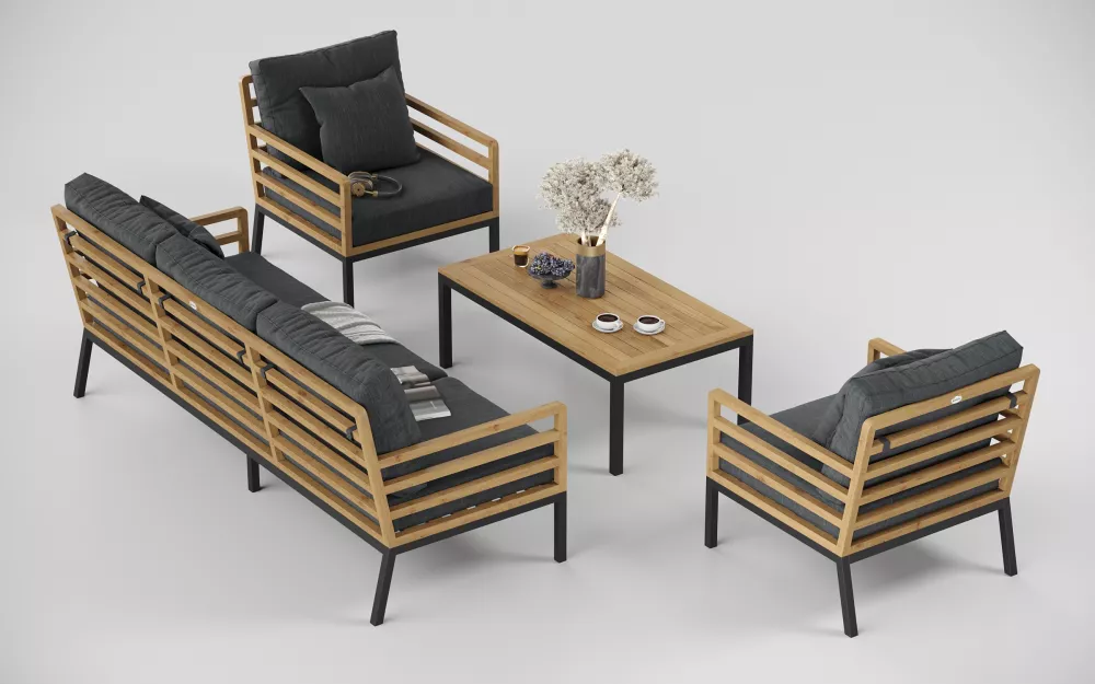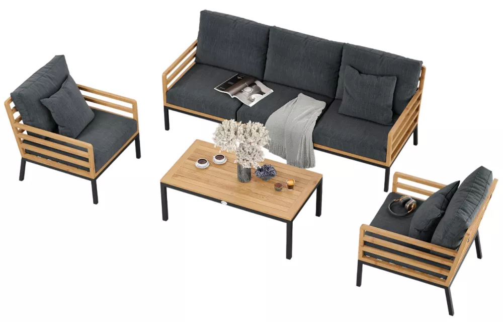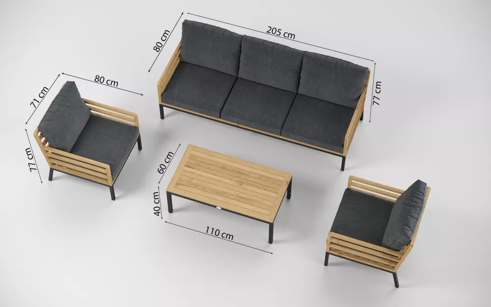 Материалы и цвета: каркас дивана и кресел изготовлен из тика, подножье выполнено из всесезонного, долговечного алюминия с порошковым покрытием темно - серого цвета (карбон), подушки спинки и сидений обшиты премиальная уличной тканью темно - серого цвета. Ткань устойчива к ультрафиолетовому излучению, водостойкая. Толщина подушек 12 см. Чехлы съемные. Каркас кофейного столика изготовлен из алюминия, столешница из тиковых планок