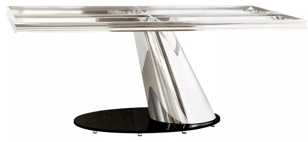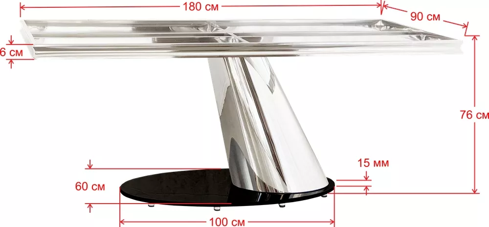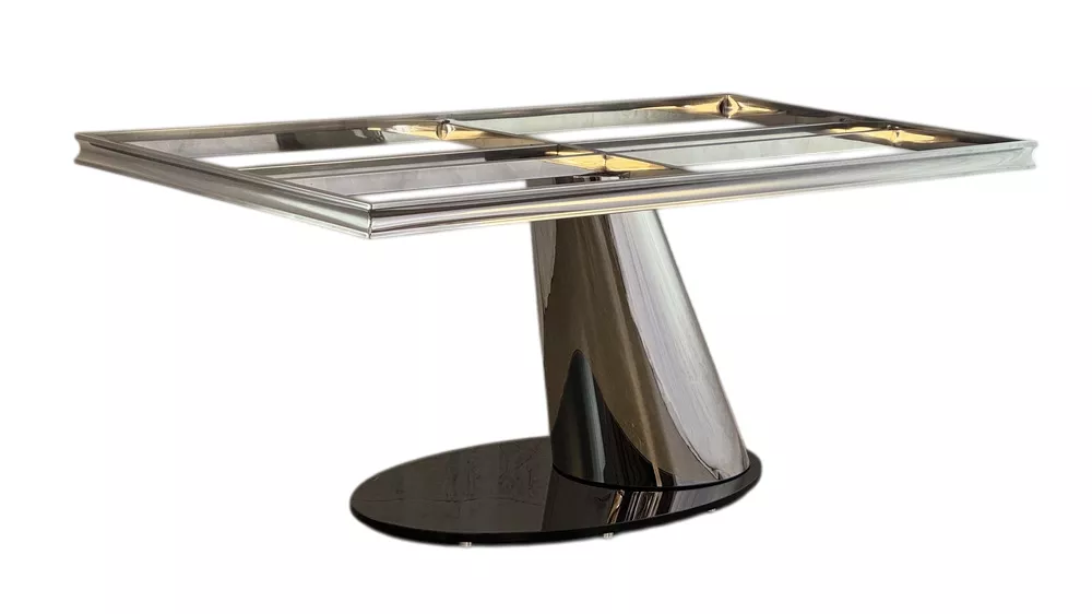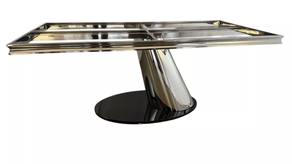 Подстолье из полированной нержавеющей (зеркальное) стали. В основании закаленное стекло толщиной 15 мм. Рама под столешницу размером 176х86 см