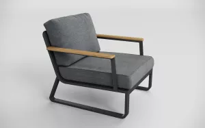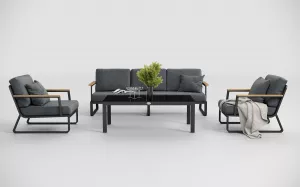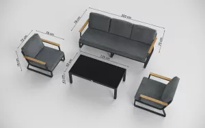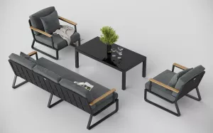 Материалы и цвета: каркас мебели выполнен из всесезонного, долговечного алюминия с порошковым покрытием темно - серого цвета (карбон), подлокотники дивана и кресел изготовлены из благородного тика, подушки спинок и сидений обшиты премиальной уличной тканью темно - серого цвета. Ткань устойчива к ультрафиолетовому излучению, водостойкая. Толщина подушек 12 см. Чехлы съемные. Столешница кофейного столика глянцевая, изготовлена из закаленного стекла толщиной 5 мм с нанесением черного цвета с помощью шелкотрафаретной печати.