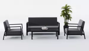 Материалы и цвета: каркас мебели выполнен из всесезонного алюминия с порошковым покрытием темно-серого цвета (карбон), подушки спинок и сидений обшиты уникальной уличной тканью Sunbrella темно-серого цвета, не выгорающей на солнце, толщина подушек сидений 15 см, планки столешницы кофейного столика темно-серого цвета (карбон) изготовлены из прочного алюминия толщиной 10 мм.