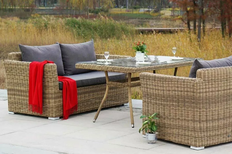 Мебель изготовлена из легкого, но прочного алюминия, оплетенного долговечным искусственным ротангом природного соломенного оттенка. На диване и креслах предусмотрены подушки.