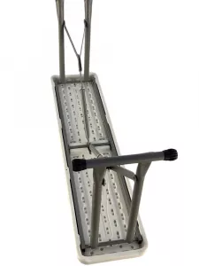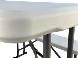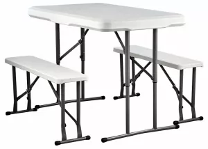Складной набор для пикника: стол и две лавочки. Все складывается в один стол. Цвет: белый (гранит). Толщина столешницы 3.5 см. Размер в сложенном состоянии 64х107х9 см. Труба d25х0.8 мм. Характеристики