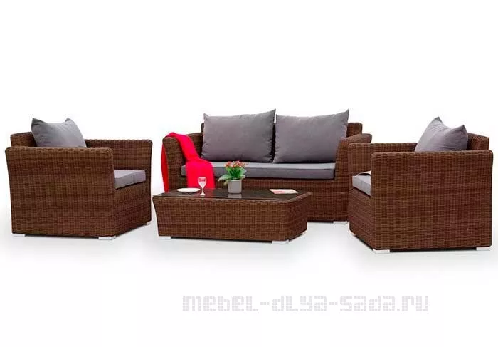 Мебель для отдыха Kapuchino предназначена для использования на улице или в помещении. Мебель выполнена из искусственного ротанга коричневого цвета. Мебель поставляется в комплекте с подушками.
