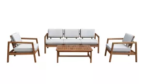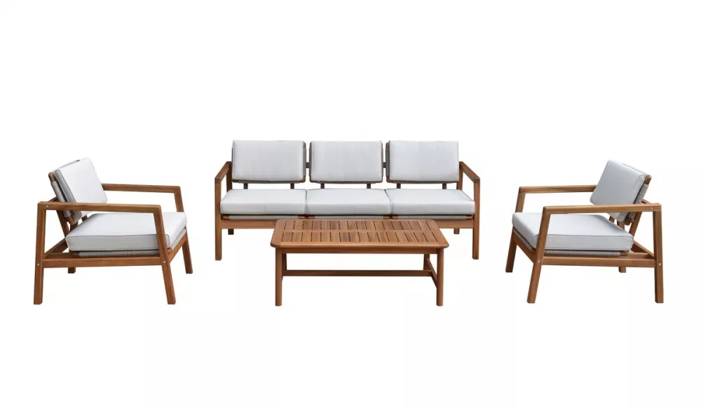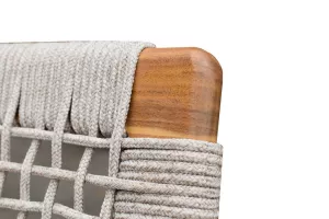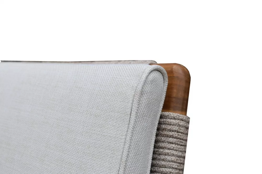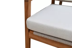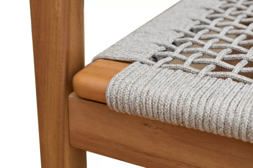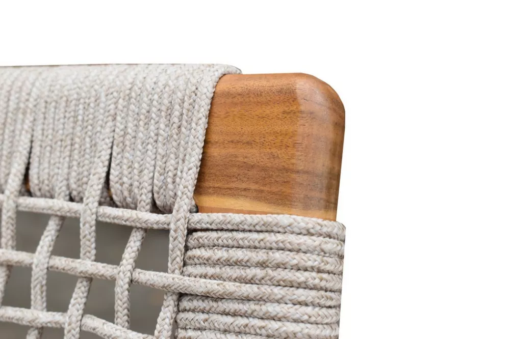 Современная коллекция садовой мебели из акации, выполненная в комбинации натурального веревочного плетения rope, массива акации и бежевых подушек.