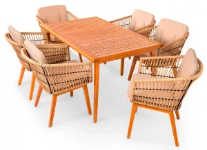 Комплект садовой мебели выполнен из искусственного ротанга, в состав комплекта входит два кресла, диван и стол.