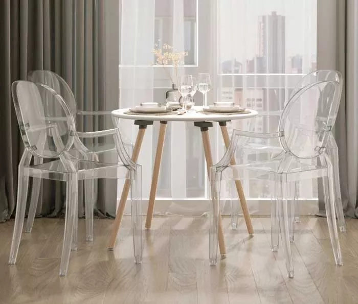Изготовлен из высококачественного материала, столешница белого цвета из МДФ. Лаконичный, оригинальный дизайнерский стол и 4 прозрачных пластиковых кресла Характеристики