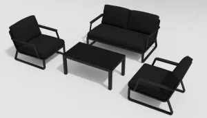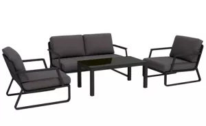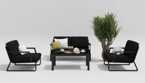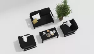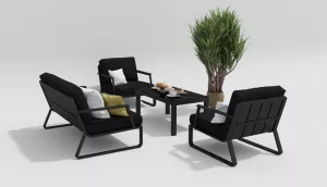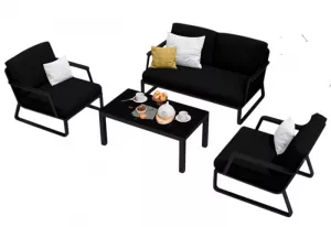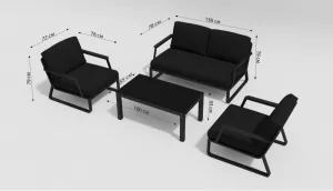 Материалы и цвета: каркас мебели выполнен из всесезонного алюминия с порошковым покрытием темно-серого цвета (карбон), подушки спинок и сидений обшиты уличной тканью черного цвета (А13814) с водоотталкивающей пропиткой, толщина подушек 12 см, столешница кофейного столика глянцевая, изготовлена из закаленного стекла толщиной 5 мм с нанесением черного цвета с помощью шелкотрафаретной печати.