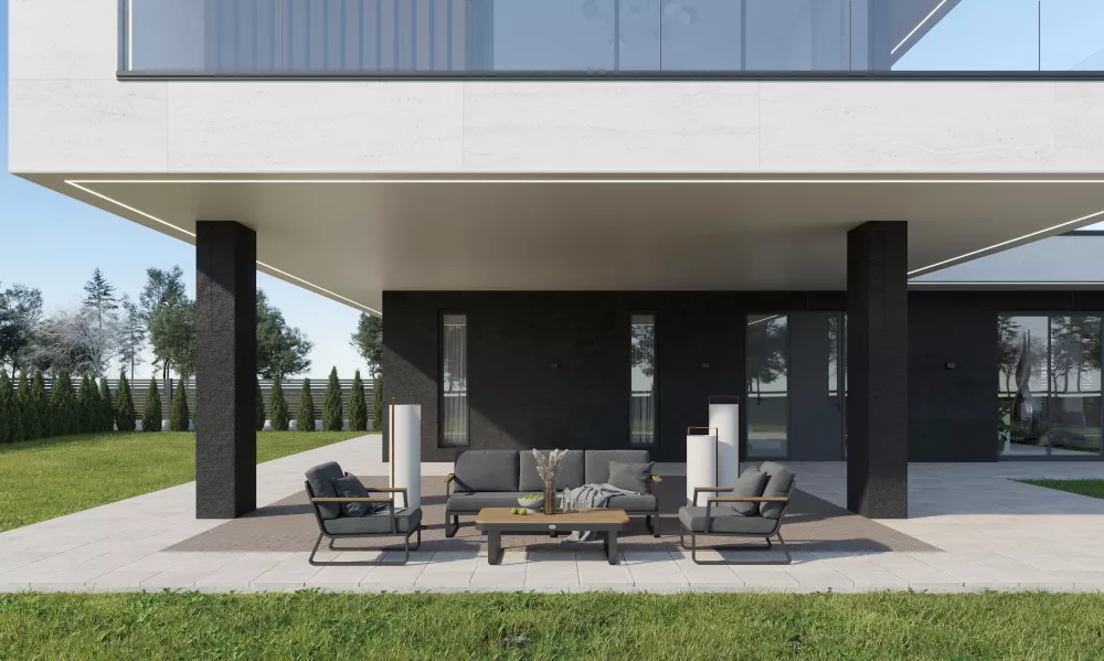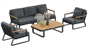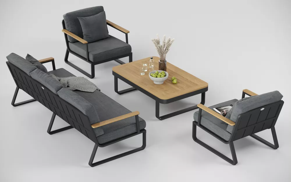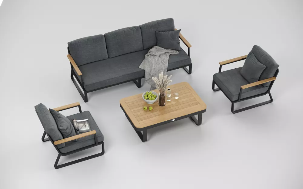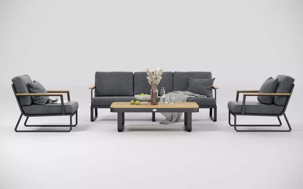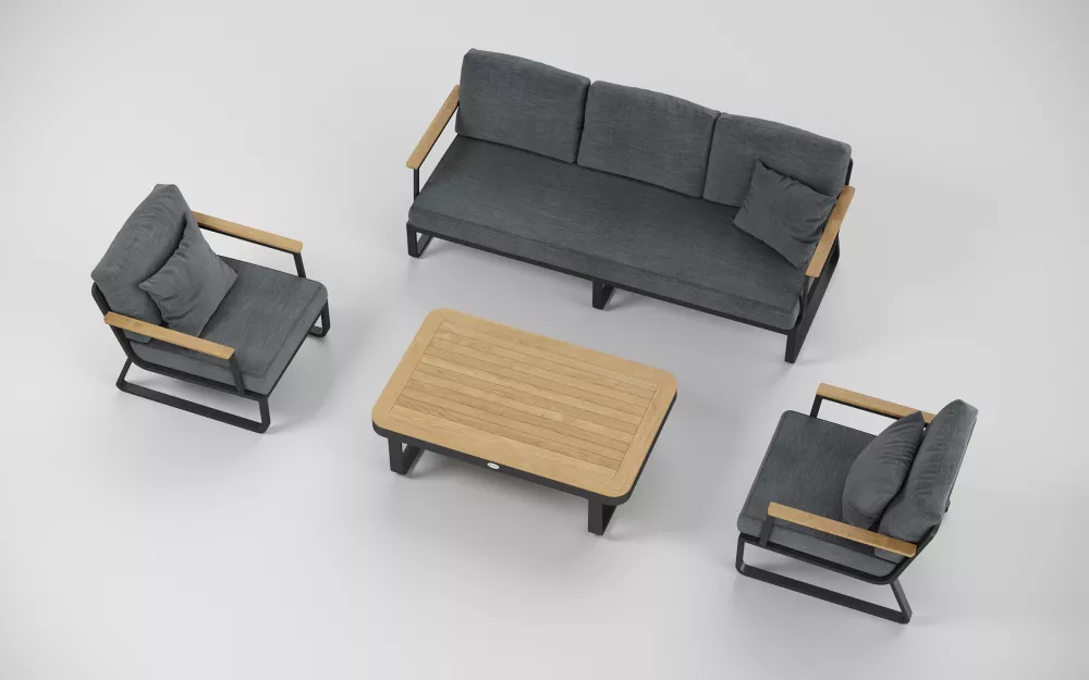 Материалы и цвета: каркас мебели выполнен из всесезонного, долговечного алюминия с порошковым покрытием темно - серого цвета (карбон), подлокотники дивана и кресел изготовлены из благородного тика, подушки спинок и сидений обшиты премиальной уличной тканью темно - серого цвета. Ткань устойчива к ультрафиолетовому излучению, водостойкая. Толщина подушек 12 см. Чехлы съемные. Столешница кофейного столика изготовлена из тиковых планок.