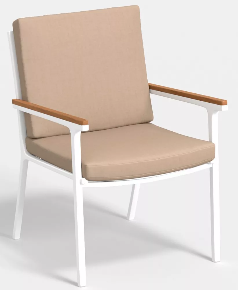 Особенности: каркас мебели выполнен из всесезонного алюминия с порошковым покрытием белого цвета, подлокотники стульев декорированы вставками из тика, подушки сидений и спинки обшиты уличной тканью бежевого цвета (А 13809) с водоотталкивающей пропиткой, толщина подушек 5 см, съемный чехол на "молнии", столешница обеденного стола изготовлена из тика.
