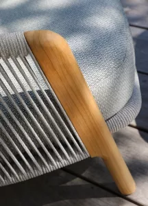 Алюминиевый каркас, ножки из тикового дерева FSC + олефиновая веревка, подушка с наполнителем из пенополиуретана, солнцезащитная ткань.