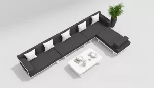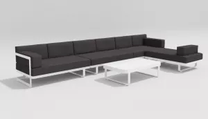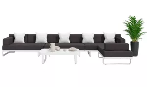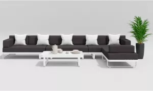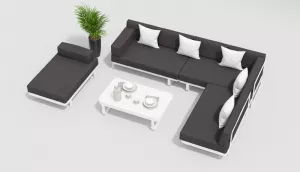 Материалы и цвета: каркас мебели выполнен из всесезонного алюминия с порошковым покрытием белого цвета, подушки спинок и сидений обшиты уличной тканью темно-серого цвета (А13805) с водоотталкивающей пропиткой, толщина подушек 12 см, столешница кофейного столика глянцевая, изготовлена из закаленного стекла толщиной 5 мм с нанесением белого цвета с помощью шелкотрафаретной печати.