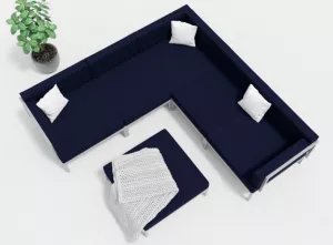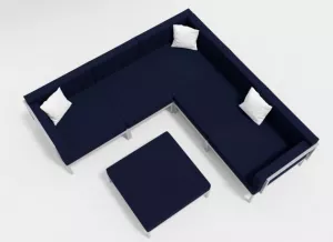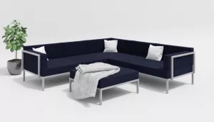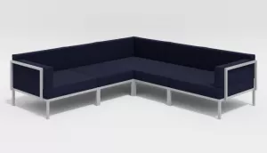 Материалы и цвета: каркас мебели выполнен из всесезонного алюминия с порошковым покрытием серебристого цвета, подушки спинок и сидений обшиты уличной тканью темно-синего цвета (А13813) с водоотталкивающей пропиткой, толщина подушек 12 см.