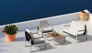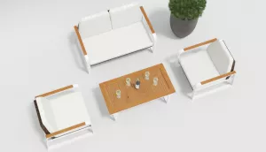 Материалы и цвета: каркас мебели выполнен из всесезонного алюминия с порошковым покрытием белого цвета, основа для сидений сделана из искусственного ротанга темно-коричневого цвета, подушки спинок и сидений обшиты уличной тканью белого цвета (А14814) с водоотталкивающей пропиткой, толщина подушек 6 см, столешница кофейного столика и подлокотники мебели изготовлены из тика.