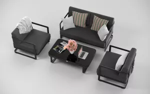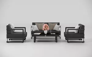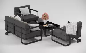 Материалы и цвета: каркас мебели выполнен из всесезонного алюминия с порошковым покрытием темно-серого цвета (карбон), подушки спинок и сидений обшиты уличной тканью темно-серого цвета (А13805) с водоотталкивающей пропиткой, толщина подушек 12 см, столешница кофейного столика глянцевая, изготовлена из закаленного стекла толщиной 5 мм с нанесением черного цвета с помощью шелкотрафаретной печати.