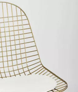 Элегантная модель обеденного золотого стула. Металлические ножки своим дизайном напоминают элемент конструкции Эйфелевой башни. Спинка и сидение выполнены из хромированного металла в оттенке золота с гальваническим покрытием. Подушка изготовлена из экокожи в белом цвете. Такой стул прекрасно дополнит интерьер дома или ресторана. Характеристики